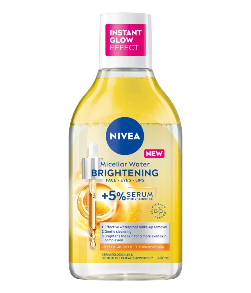 NIVEA Rozświetlający Płyn Micelarny z witaminami C i E oraz kompleksem aminokwasów błyskawicznie usuwa makijaż, jednocześnie rozjaśnia, energetyzuje i nawilża, wydobywając zdrowy blask i ujednolicając koloryt cery.