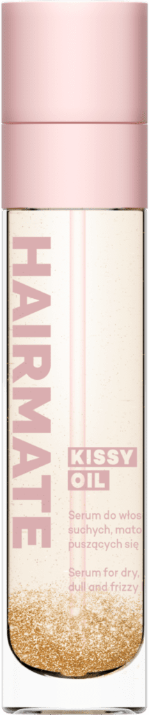 KISSY OIL od marki Hairmate to olejek zamknięty w eleganckim, szklanym opakowaniu z różowymi elementami. Wzbogacony w olej z orzechów brazylijskich i złote drobinki, serum dogłębnie odżywia i kondycjonuje włosy, nadaje im cudowny połysk, minimalizuje puszenie i elektryzowanie, uelastycznia oraz zabezpiecza przed niesprzyjającymi czynnikami zewnętrznymi. W dodatku jego kompozycja zapachowa jest niczym najpiękniejsze perfumy – znajdziesz w niej piżmo, wanilię, bergamotkę, cedr, sandałowiec i heliotrop, aby włosy roztaczały wokół Ciebie słodki, elegancki aromat.